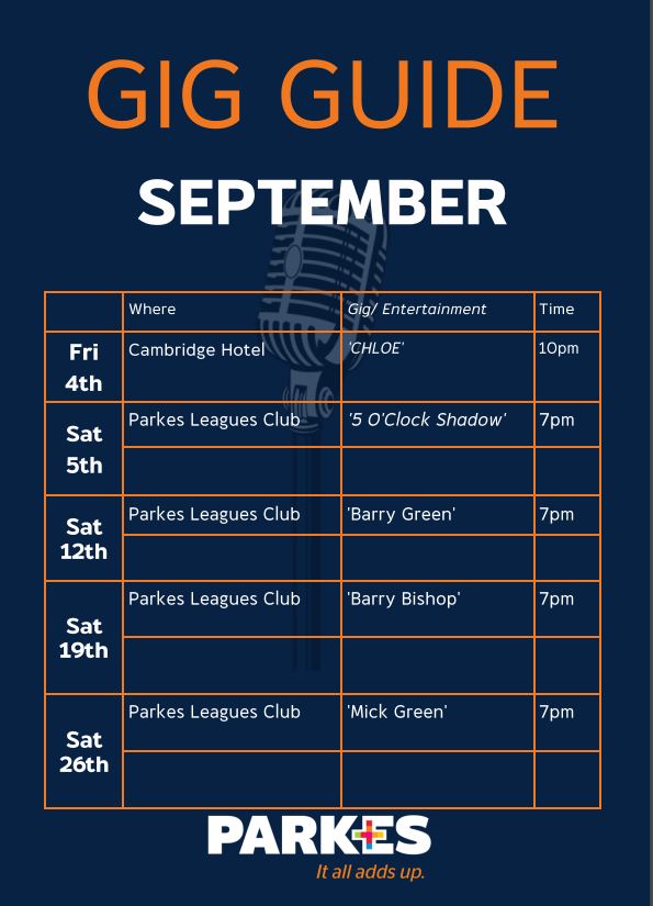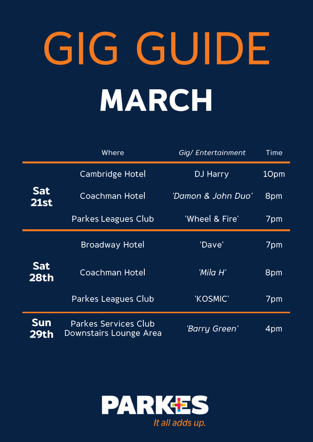 The weekly Gig Guide will keep you up to date with details on live music and entertainment in and around Parkes.